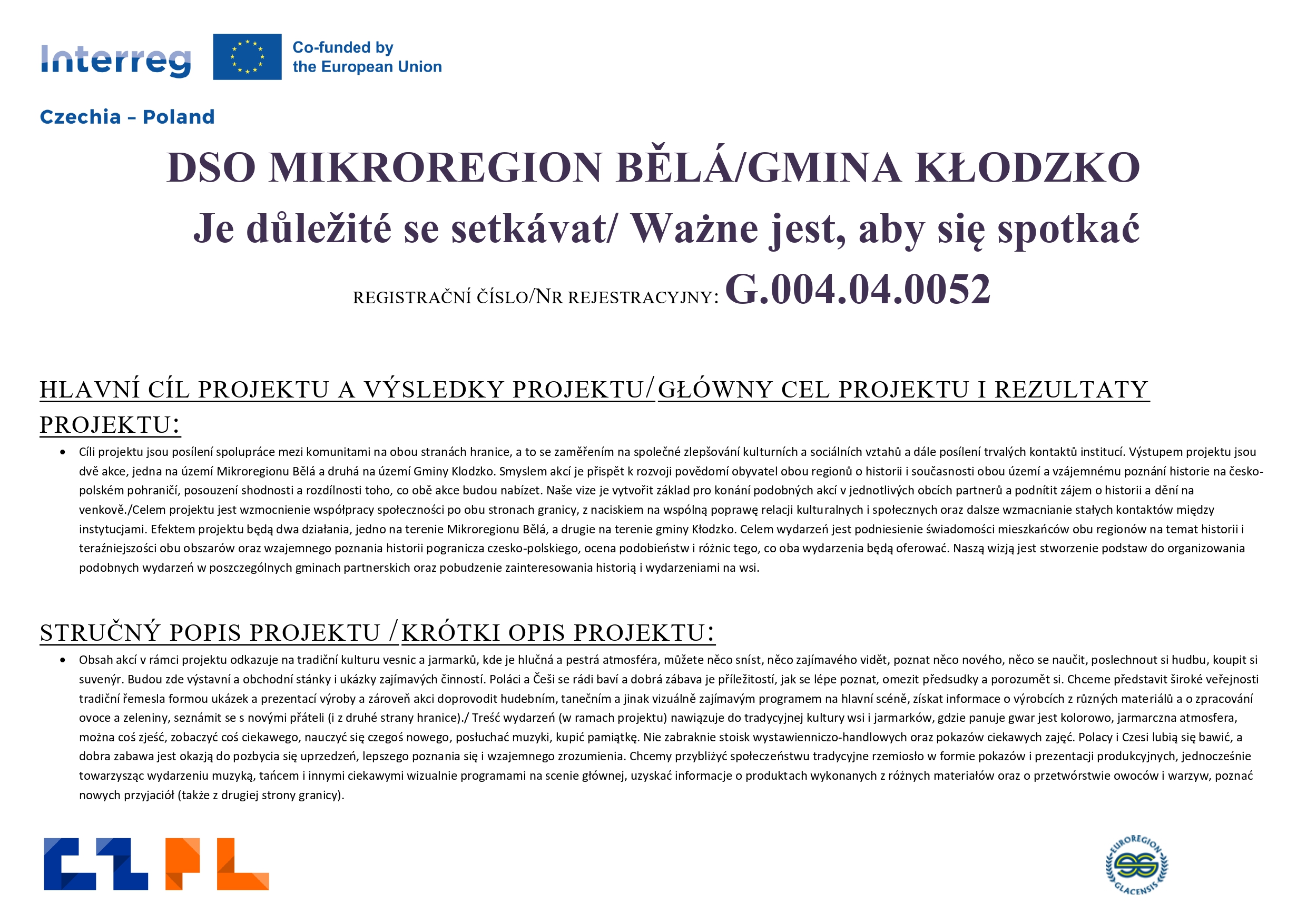 Gmina Kłodzko wspólnie z Mikroregionem Bělá realizuje projekt, współfinansowany przez UE w ramach Europejskiego Funduszu Rozwoju Regionalnego, Programu INTERREG Czechy – Polska 2021-2027 za pośrednictwem Euroregionu Glacensis.