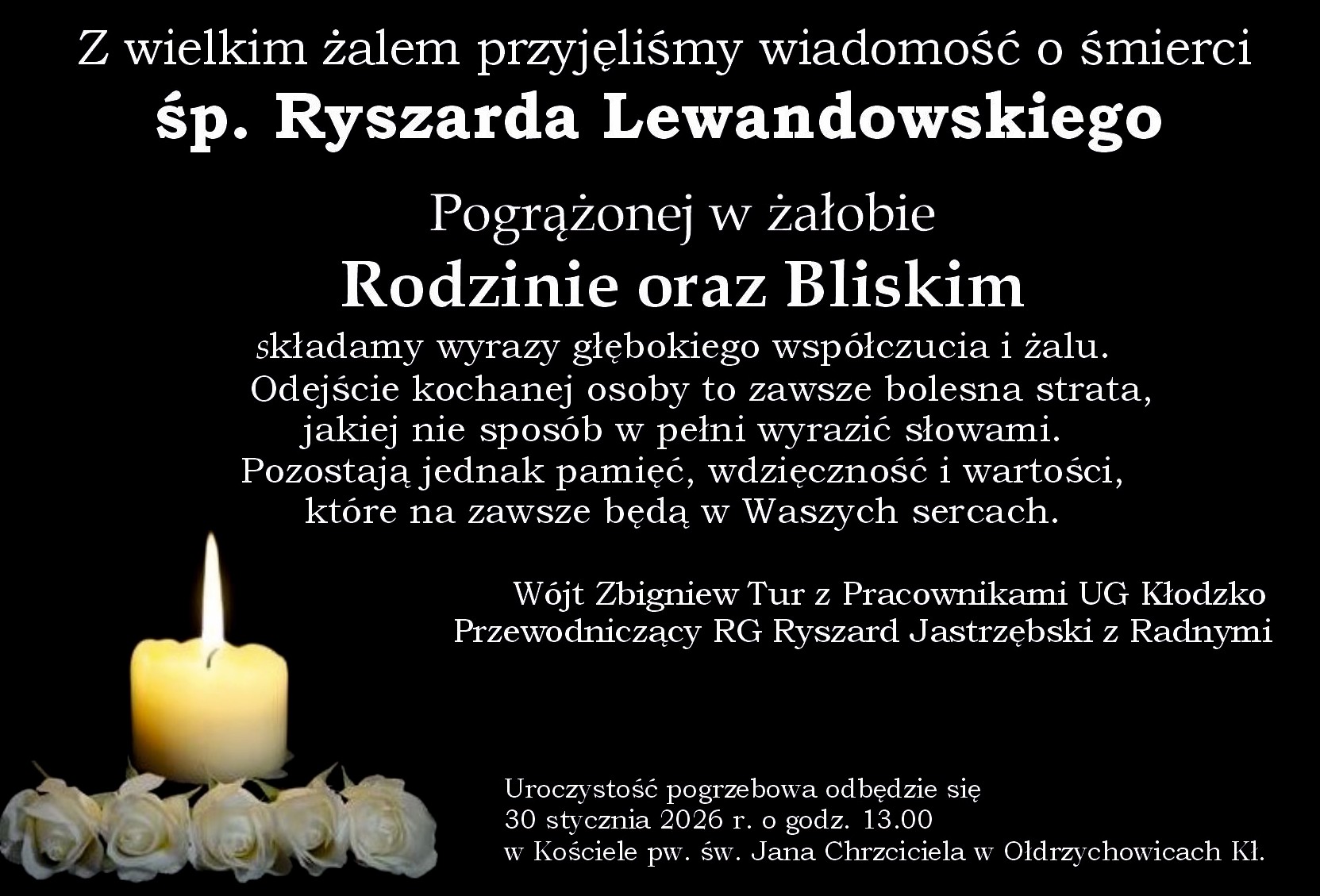 Uroczystość pogrzebowa odbędzie się 30 stycznia 2026 r. o godz. 13.00 w Kościele pw. św. Jana Chrzciciela w Ołdrzychowicach Kł.