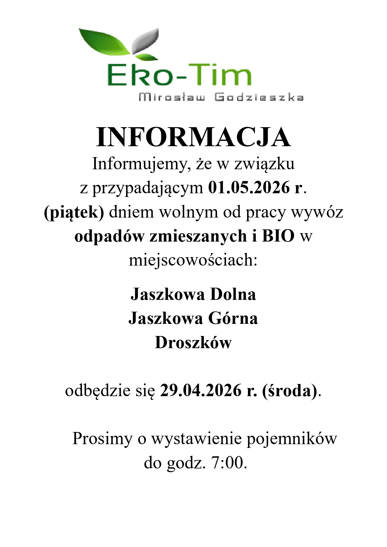 - Z kolei w Jaszkowej Dolnej, Jaszkowej Górnej i Droszkowie w tym samym dniu odbędzie się wywóz odpadów zmieszanych i BIO.