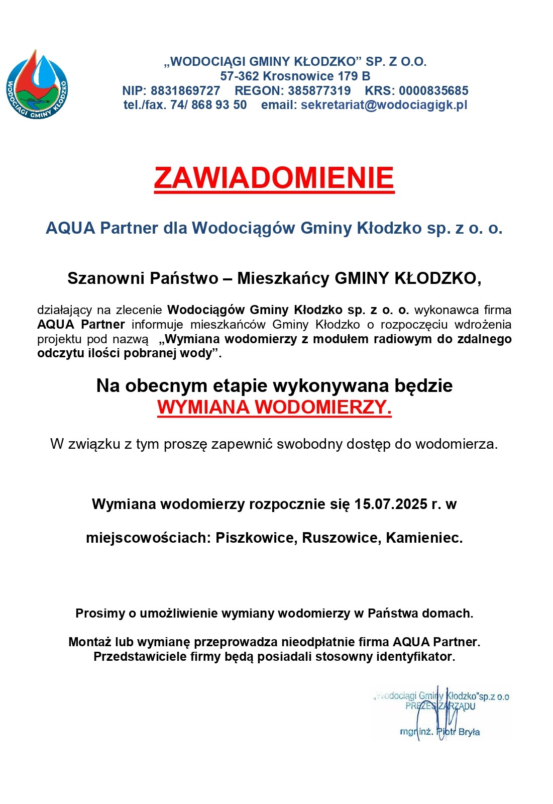 Na obecnym etapie wykonywana będzie wymiana wodomierzy. W związku z tym proszę zapewnić swobodny dostęp do wodomierza. Wymiana wodomierzy rozpocznie się 15.07.2025 r. w miejscowościach: Piszkowice, Ruszowice, Kamieniec.