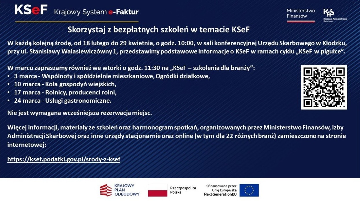 Więcej informacji, materiały ze szkoleń oraz harmonogram spotkań, organizowanych przez Ministerstwo Finansów, Izby Administracji Skarbowej oraz inne urzędy stacjonarne oraz online (w tym dla 22 różnych branż) zamieszczono na stronie internetowej: https://ksef.podatki.gov.pl/srody-z-ksef/