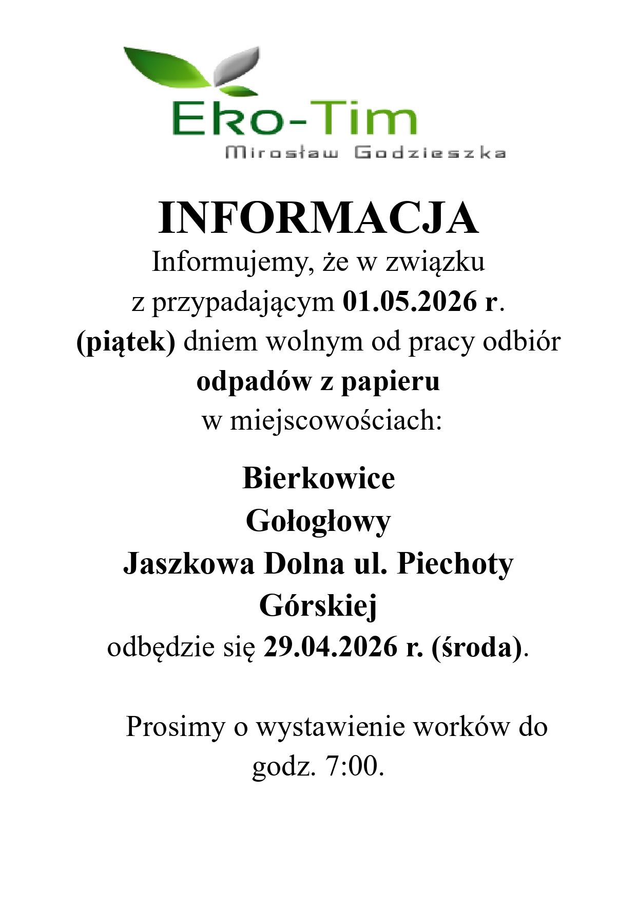 - Dotyczy to: Bierkowic, Gołogłów, Jaszkowej Dolnej – ul. Piechoty Górskiej – odpady z papieru odebrane zostaną w środę (29.04).